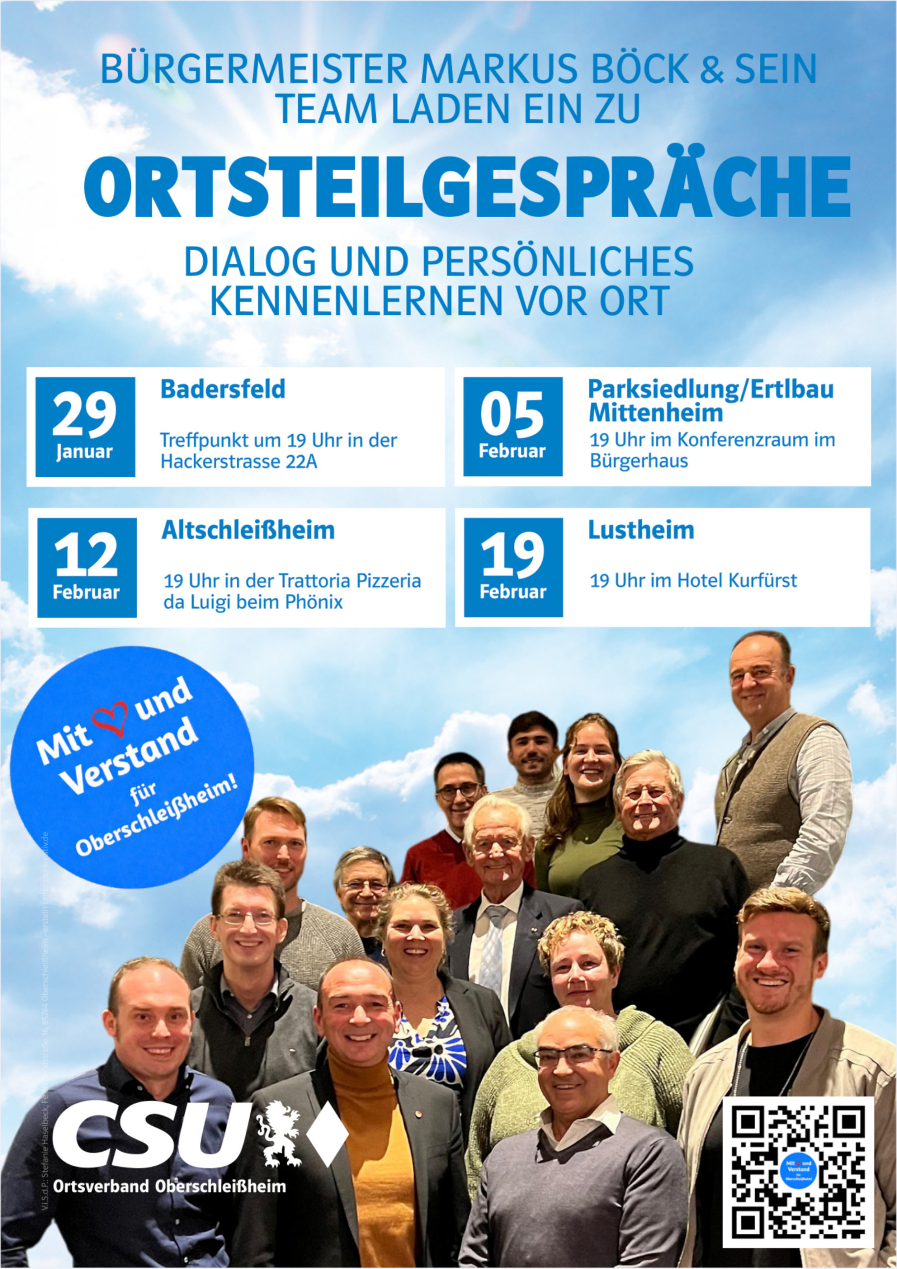 Bürgernähe bedeutet für uns vor allem eines: persönlicher Austausch. Deshalb laden wir Sie herzlich zu unseren geplanten Ortsteilgesprächen ein. Am 12.02. für Altschleißheim in der Trattoria Pizzeria da Luigi beim… |